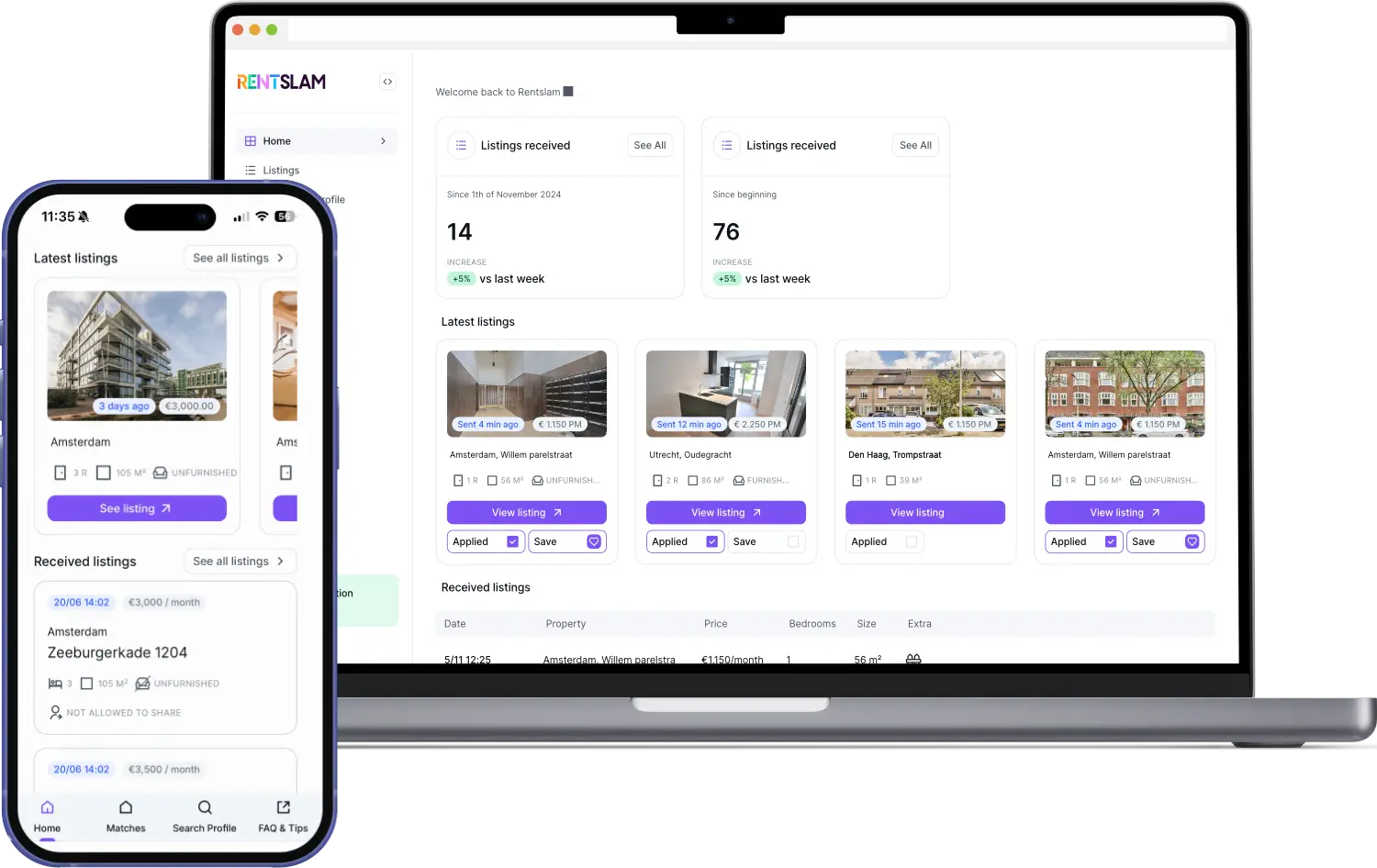 RentSlam zoekt 24/7 met AI op alle betrouwbare verhuursites. Komt er een nieuwe woning online? Dan ontvang je ‘m binnen 30 seconden. Zo heb je meer kans op een bezichtiging en grotere kans op succes.